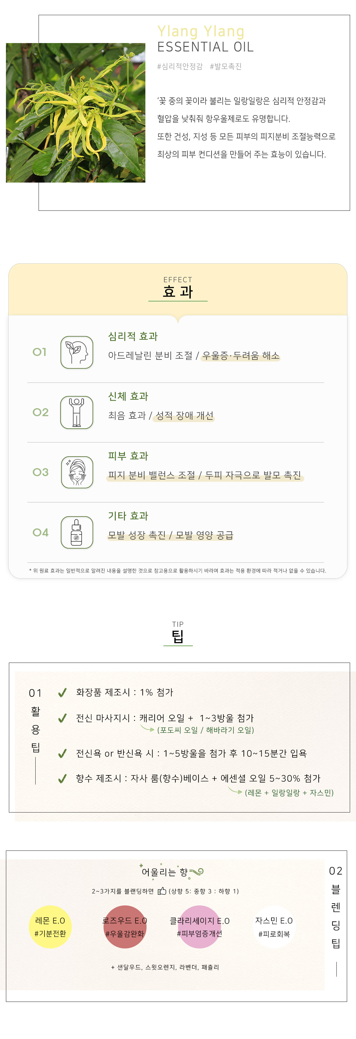 - 향이 강하여 민감하게 반응하는 개인차가 있으며, 과량 사용 시 두통이나 구토를 유발할 수 있습니다. - 에센셜 오일은 식물에서 추출된 천연 오일입니다. 식물은 자연환경에 따라 함유하는 성분, 색상, 향기가 조금씩 다를 수 있습니다. 원료 입고 시기에 따라 색상과 향이 다를 수 있는 점 양해 바랍니다. 아로마테라피적인 기능은 크게 달라지지 않으니 참고하여 구매해 주시기 바라며 이로 인한 교환·환불은 불가하니 유의해 주시기 바랍니다. |