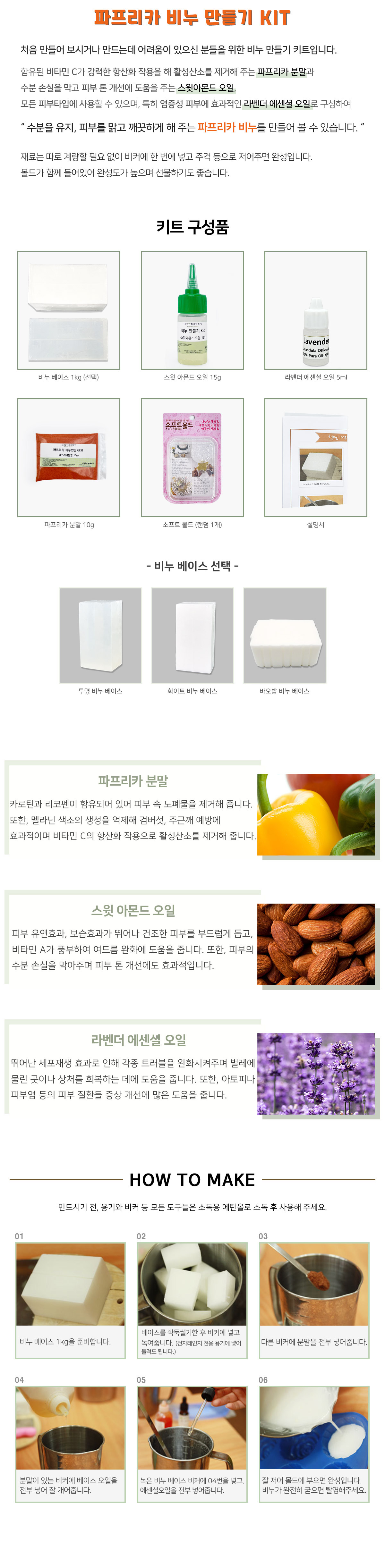 비누 베이스 1kg + 스윗 아몬드 오일 15g + 파프리카 분말 10g + 라벤더 비누용 에센셜 오일 5ml + 소프트 플라스틱 몰드 1개 |