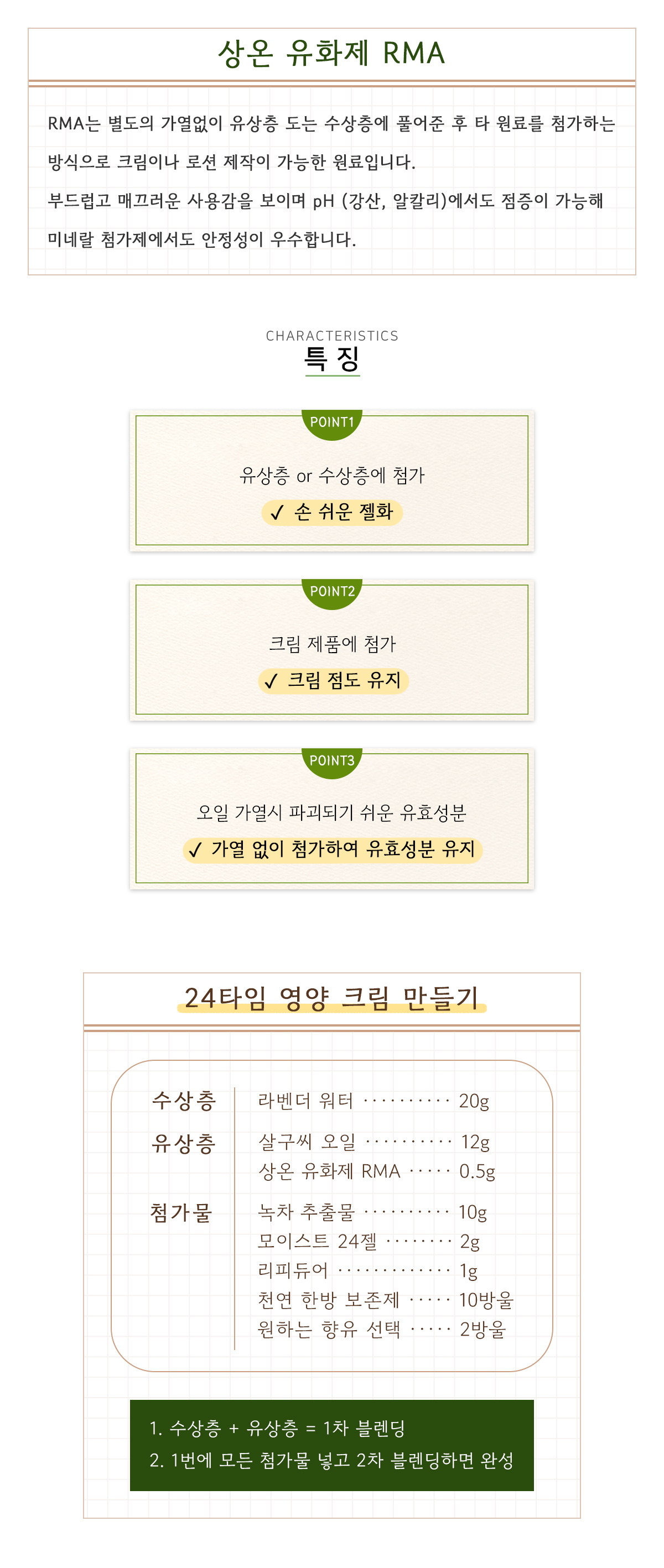 - 비누와 화장품을 만드는 원료로만 사용하세요. - 민감성 피부인 사람은 소량 테스트 후 사용하시기를 권장합니다. - 원료 입고 시기에 따라 입자크기, 색상, 취가 약간 다를 수 있는 점 양해 바랍니다. 원료적 기능은 크게 달라지지 않으니 참고해 주세요. |