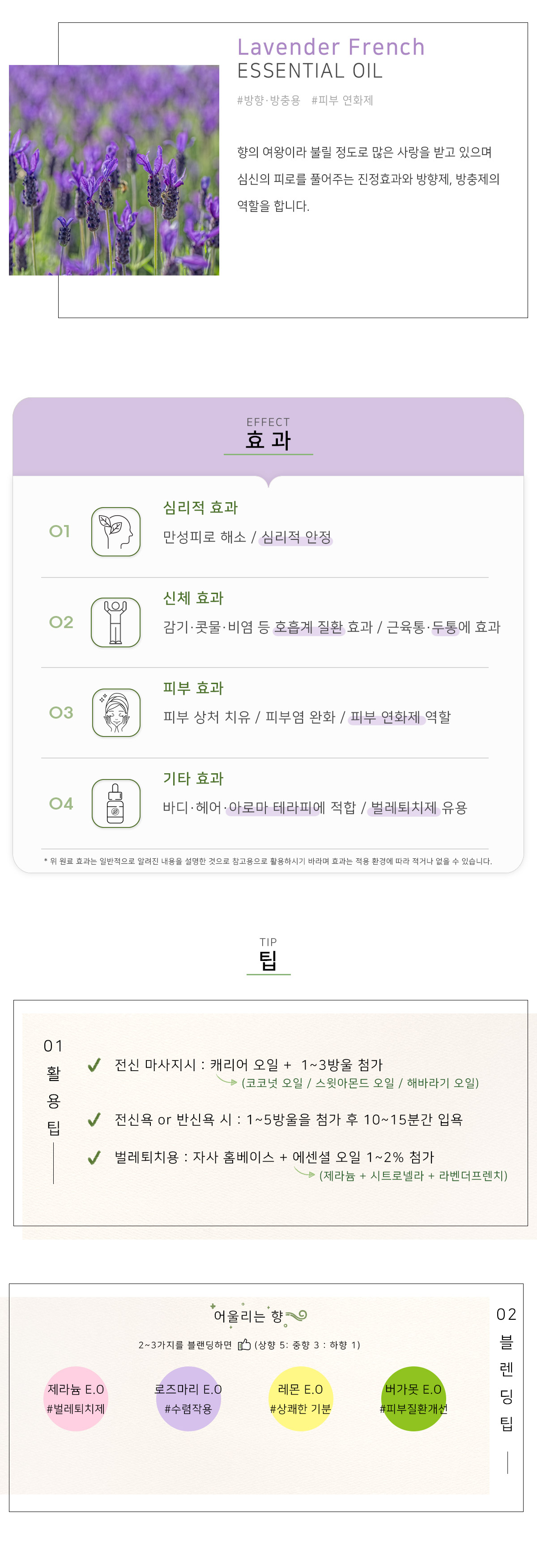 - 라벤더 프렌치 오일은 주로 비누, 디퓨저, 벌레퇴치 등 으로 사용하기 좋은 오일입니다. - 혈압을 낮추는 혈압강하작용으로 고혈압이 있으신 분에 적합하며, 월경을 유도하는 통경제 성분이 포함되어 있어 임산부는 사용을 피하세요. - 에센셜 오일은 식물에서 추출된 천연 오일입니다. 식물은 자연환경에 따라 함유하는 성분, 색상, 향기가 조금씩 다를 수 있습니다. 원료 입고 시기에 따라 색상과 향이 다를 수 있는 점 양해 바랍니다. 아로마테라피적인 기능은 크게 달라지지 않으니 참고하여 구매해 주시기 바라며 이로 인한 교환·환불은 불가하니 유의해 주시기 바랍니다. |