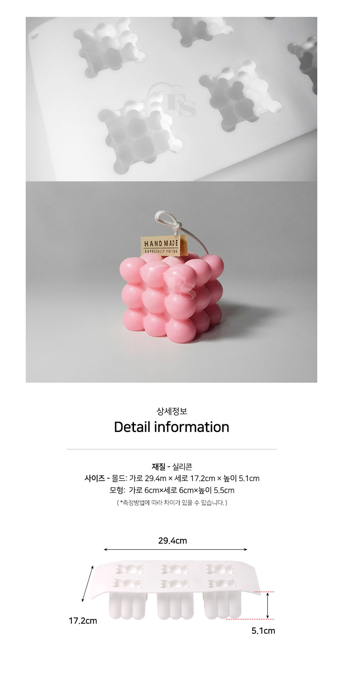 사 이 즈 | 몰드 : 가로 29.4cm / 세로 17.2cm / 높이 5.1cm 모형 : 가로 6cm / 세로 6cm / 높이 5.5cm (*측정방법에 따라 차이가 있을 수 있습니다.) |