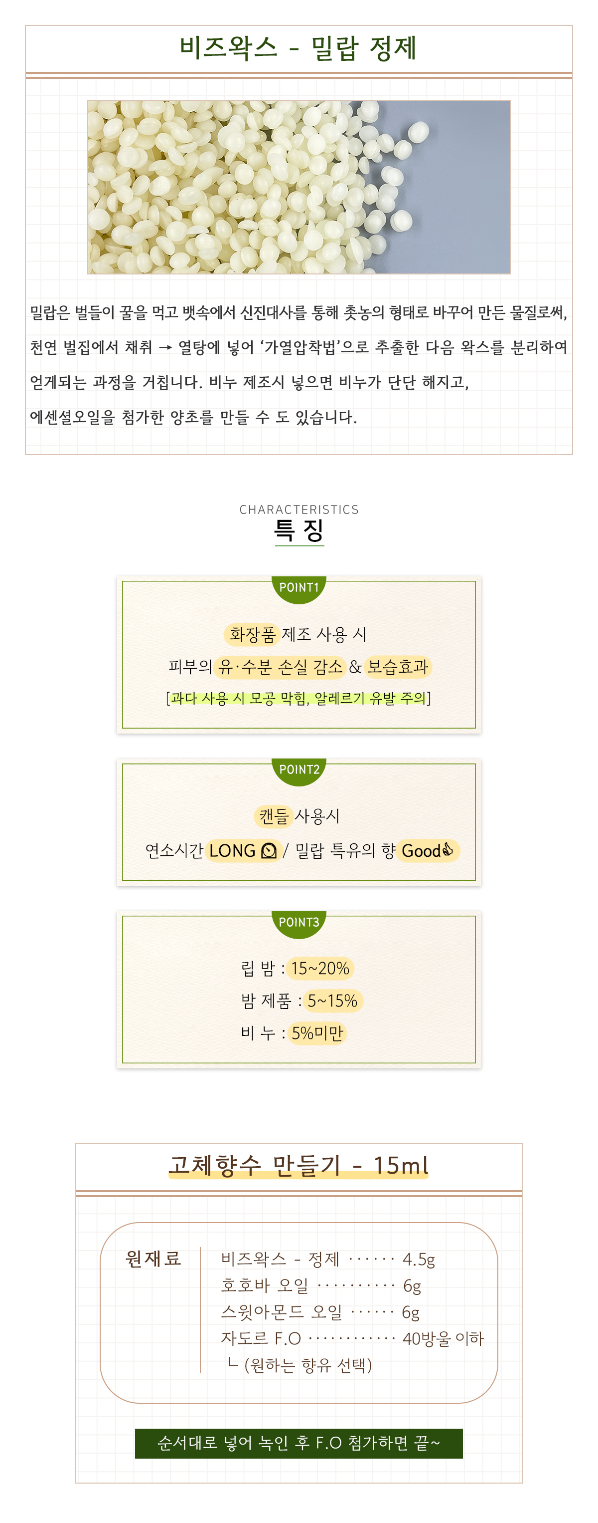 | 추천사용량 | 립밤 (롤링) : 15 ~ 20% / 밤 제품 : 5 ~ 15% / 비누 : 5% 미만 |