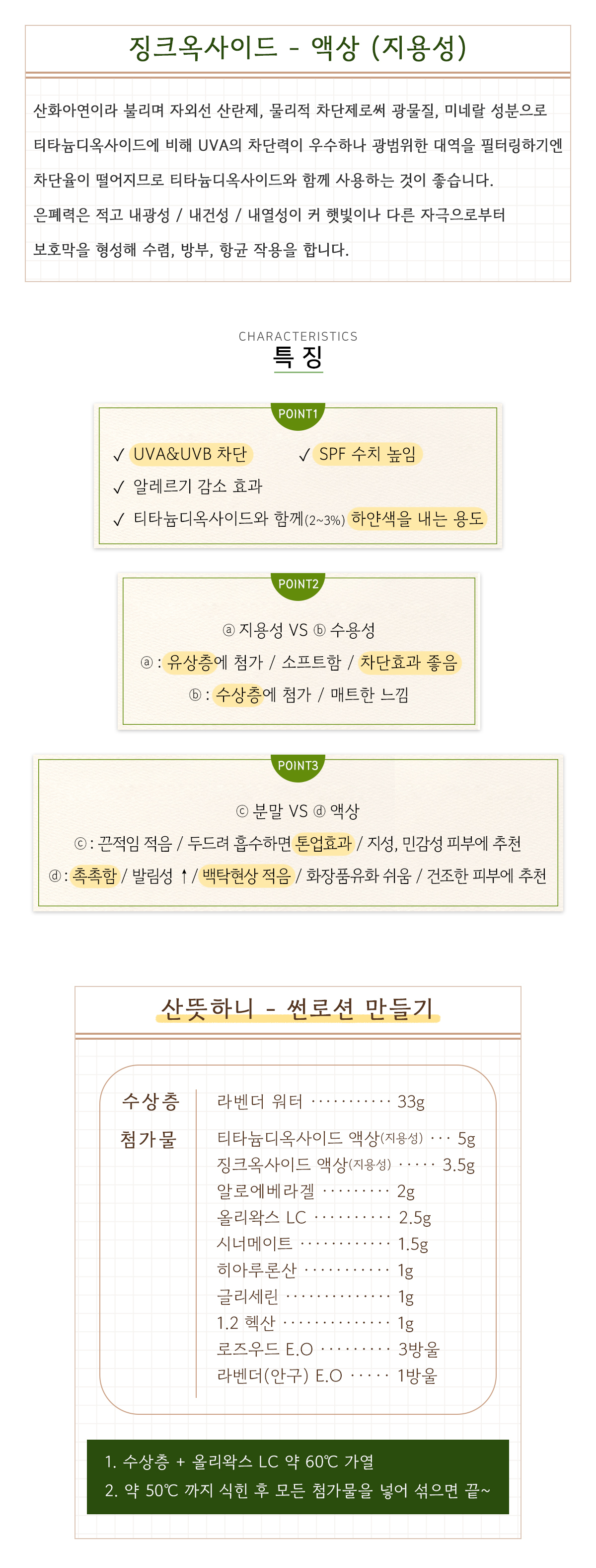 - 점성있는 백색 액상 (지용성) - 액상 타입으로 분말 타입보다 화장품 유화가 쉬운 편입니다. |