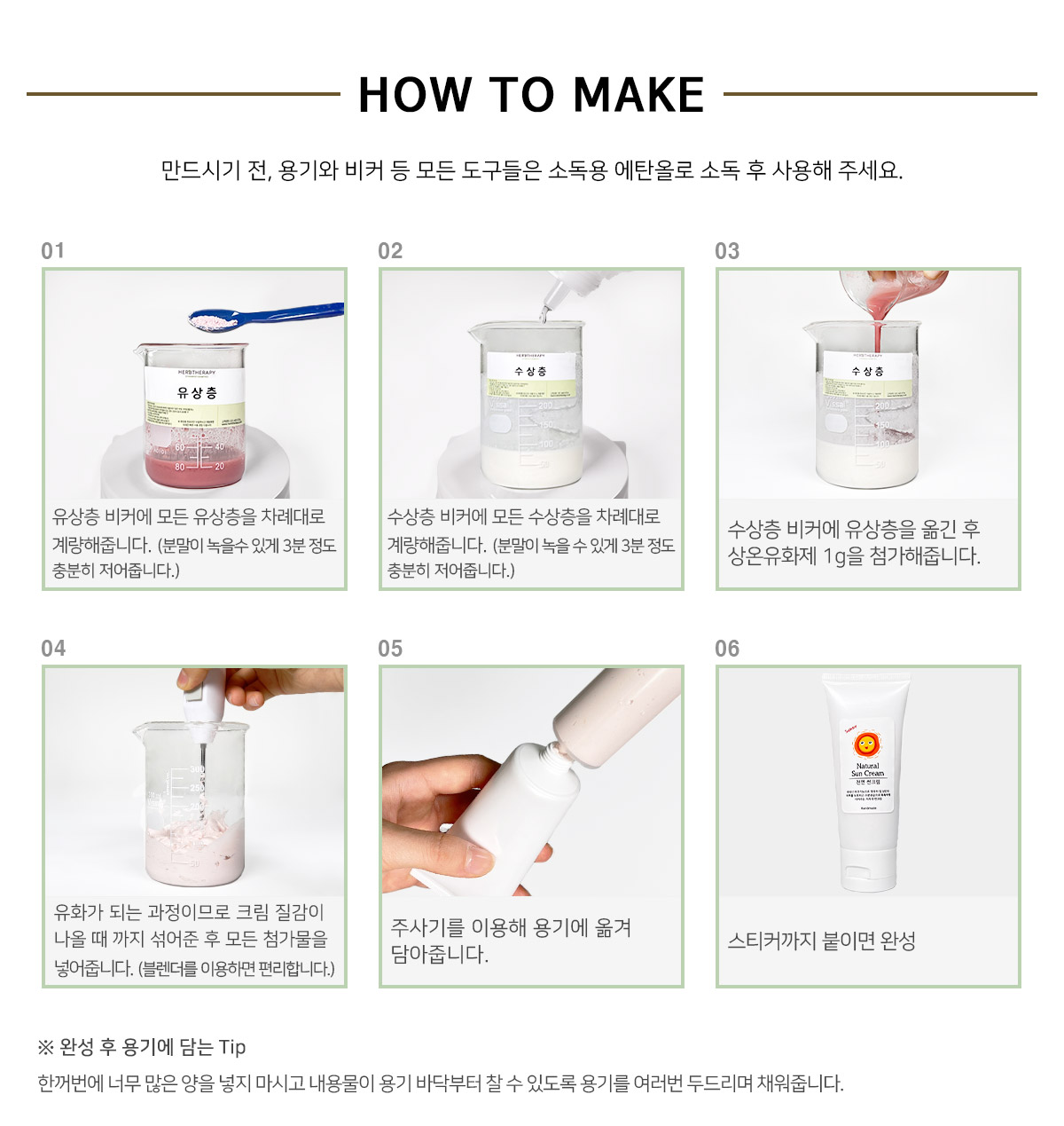 | 징크옥사이드 - 분말(수용성) | 3g | UVA와 UVB 양쪽을 다 차단시켜 주며 SPF 수치를 높여줌 |